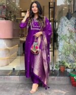 Women’S And Girls Wear Purple Color Roman Silk Embroidered Work A-Line Kurta, Pant and Dupatta Set Size-XL