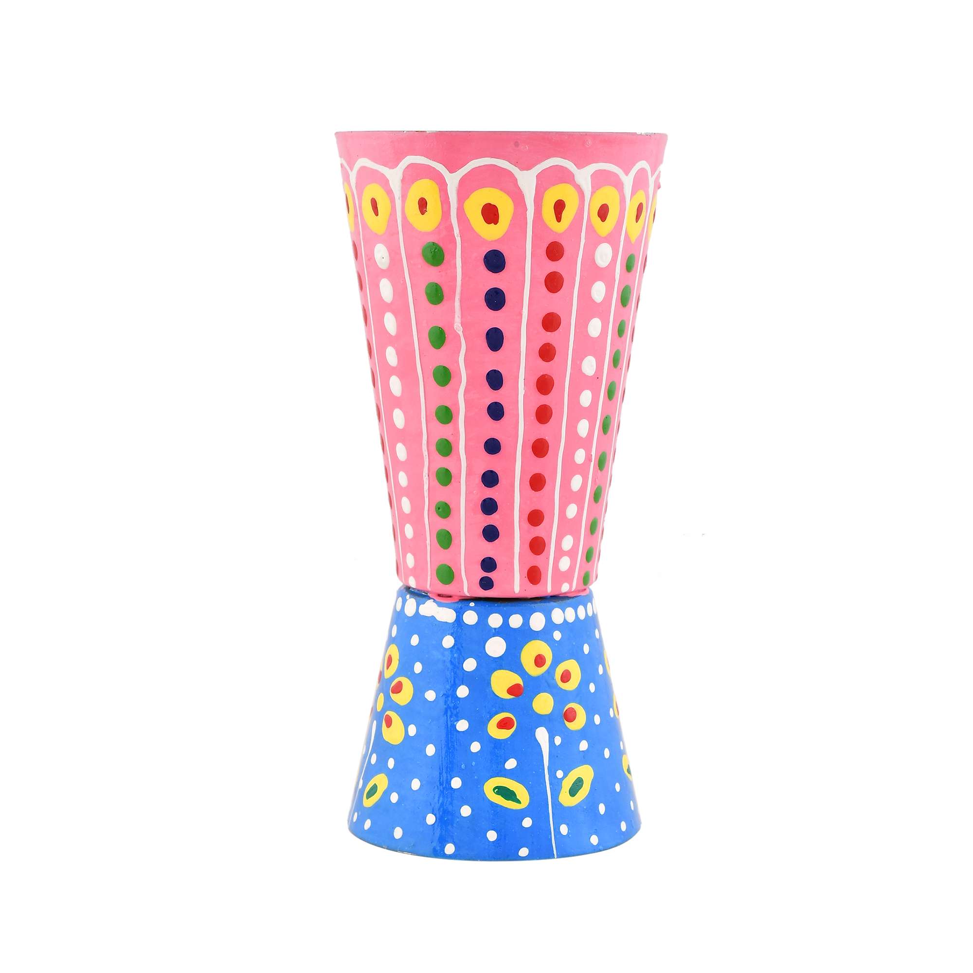 Brighten up your mixology moments with this hand-painted pink and blue stainless steel jigger, a cheerful blend of function and folk art. The top half features vertical floral patterns in pink, yellow, and green, while the bottom half bursts with playful blue and orange blooms – all carefully painted by skilled Indian artisans. This dual-sided bar tool provides accurate 30ml and 60ml measurements, making it a stylish and practical addition to any bar setup. Whether for personal use or gifting, this jigger adds charm, color, and cultural heritage to your barware collection.