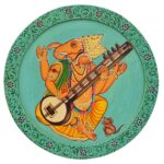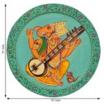 This beautiful pichwai painting features a majestic ganesh ji perched on a vibrant flowering branch.