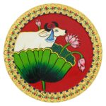 This hand-painted pichwai depicts a sacred cow sitting on a lotus flower. The cow is a symbol of fertility, abundance, and motherhood in Hinduism, and the lotus flower is a symbol of purity and enlightenment. The painting is made with natural pigments on cotton cloth, and it is framed in a traditional wooden frame. This unique piece of art would be a beautiful addition to any home.
